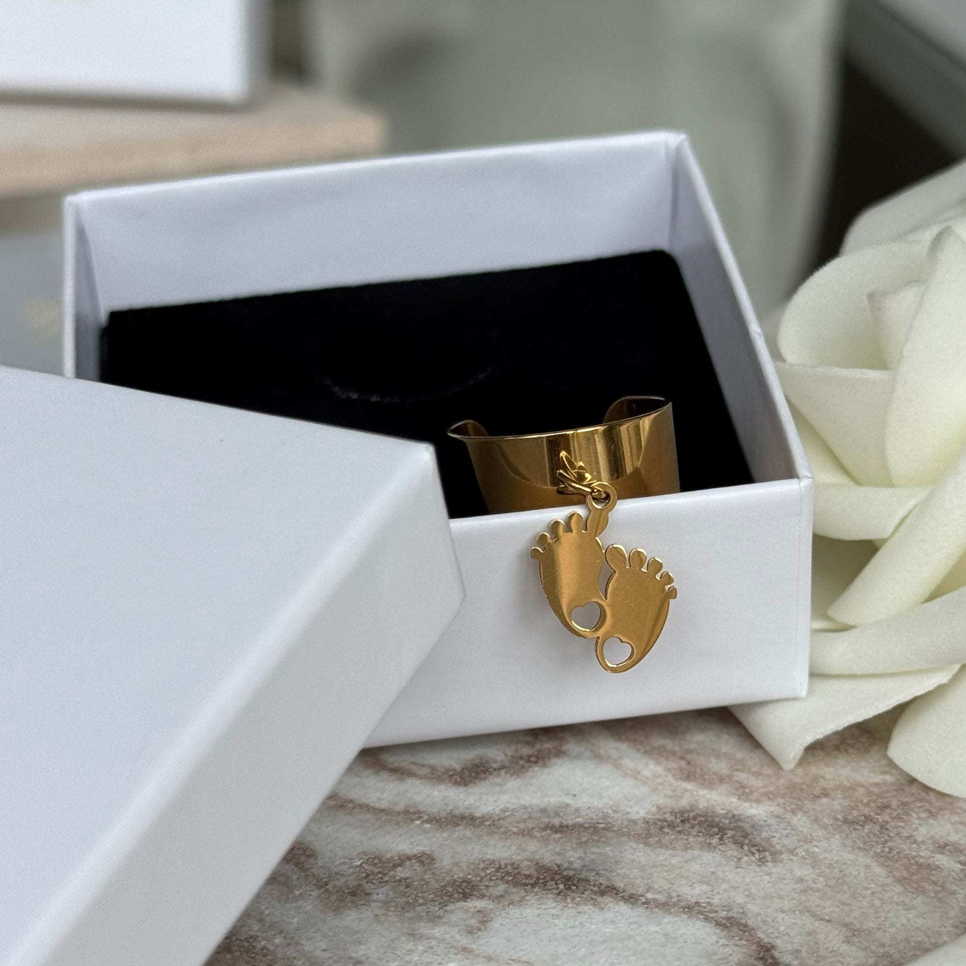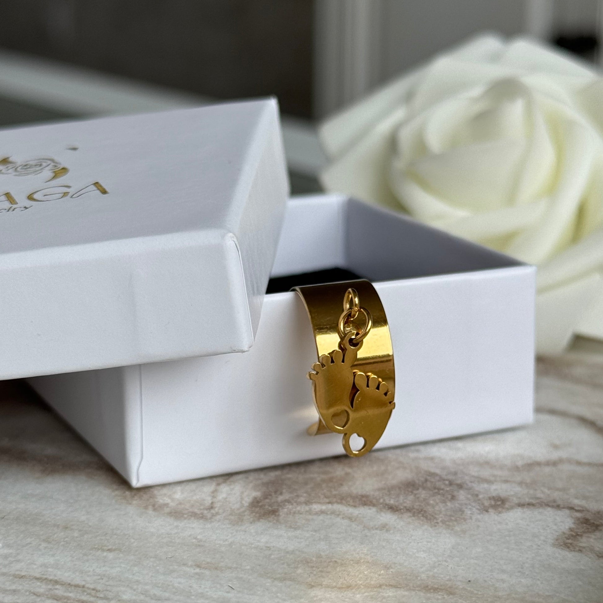 Finition : Bague large en acier Inoxydable doré et pendentif petits pieds de bébé