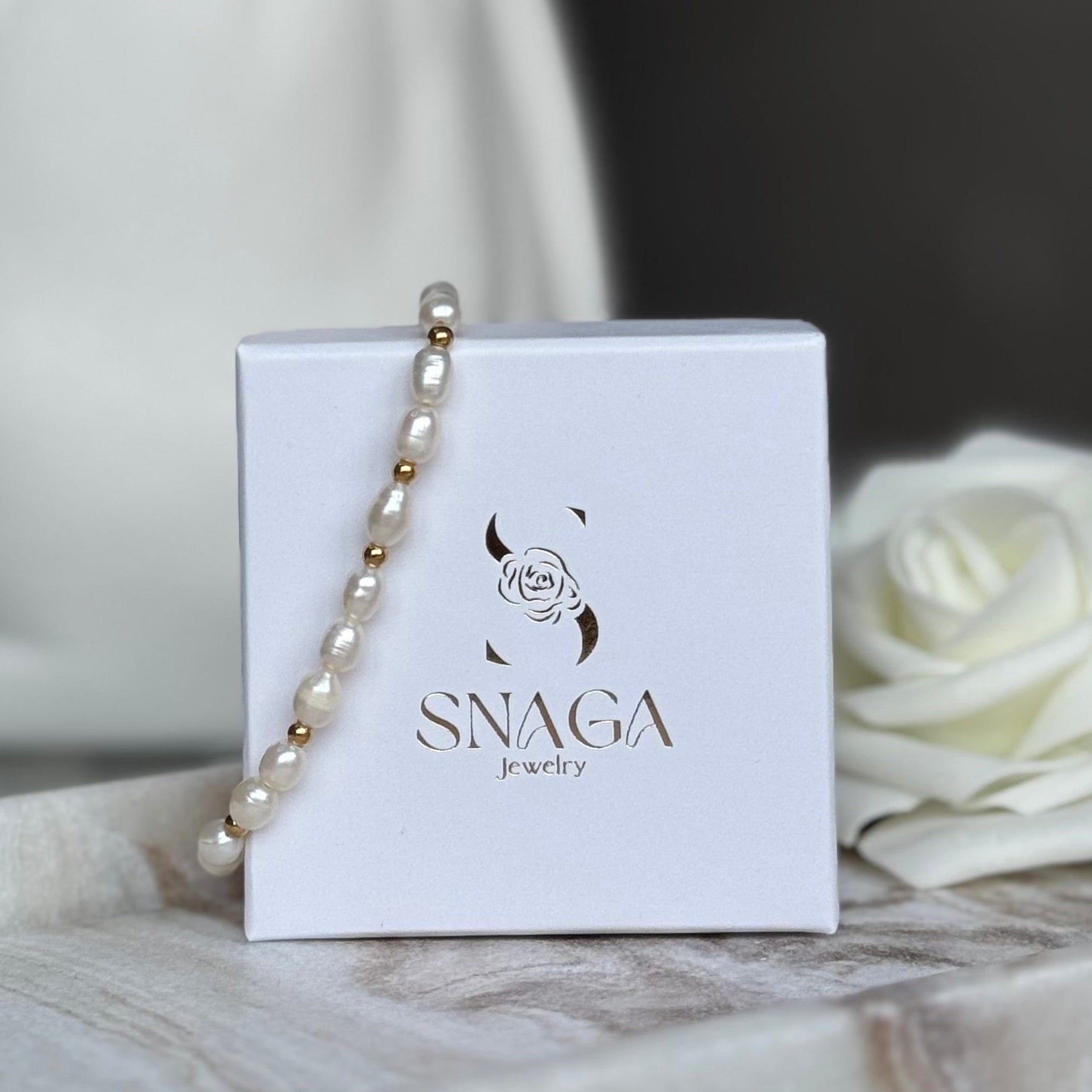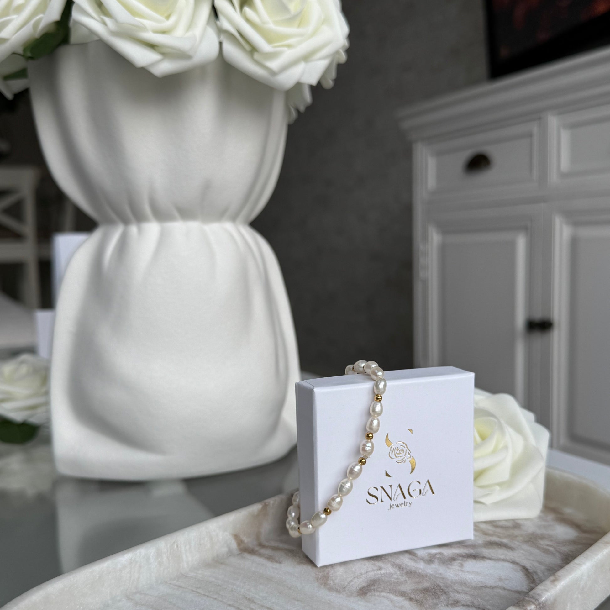 Finition : Créé à la main sur un fil élastique, petites perles de culture et billes en acier Inoxydable doré
