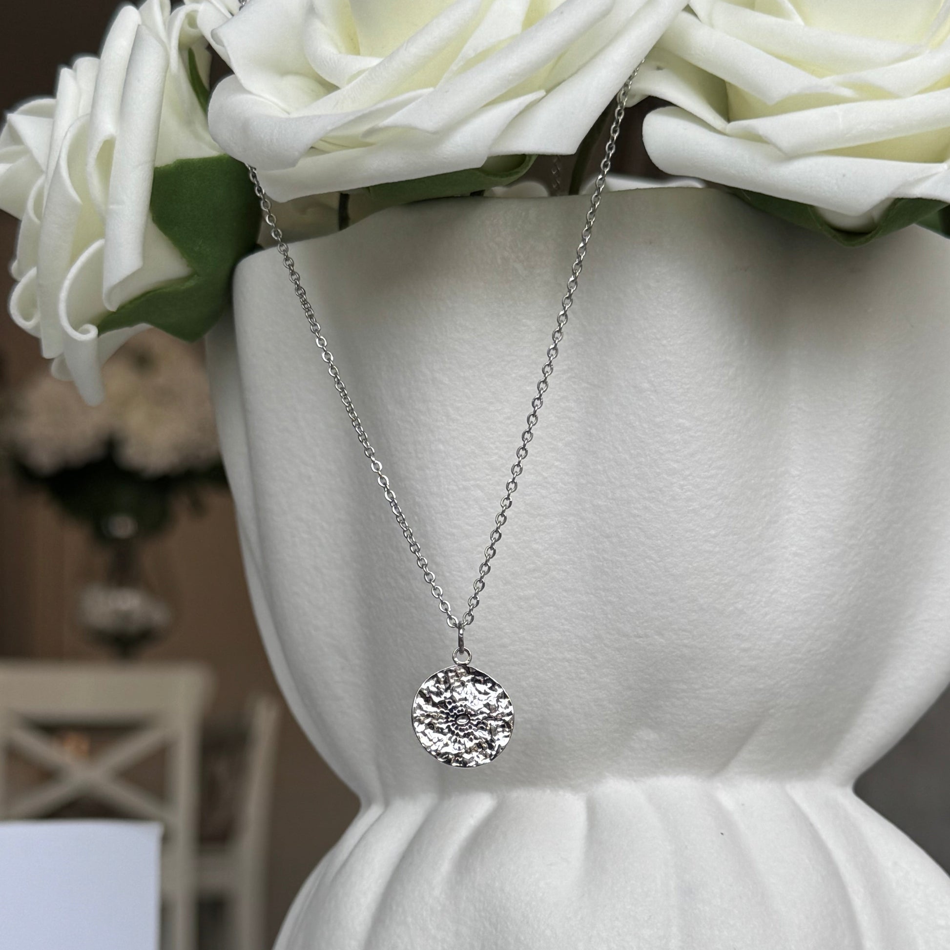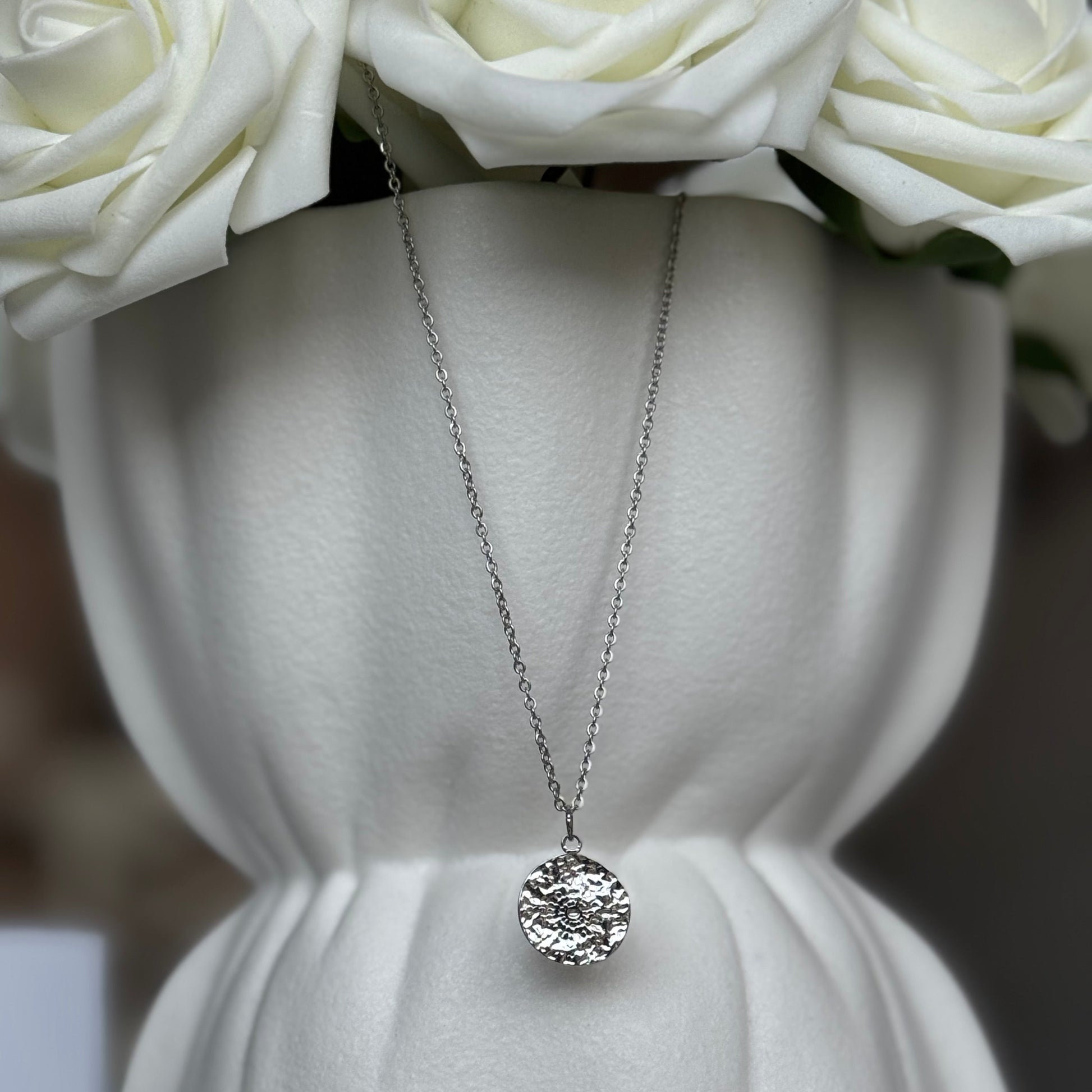 ROSALIE - Collier création médaillon en acier Inoxydable argenté martelé