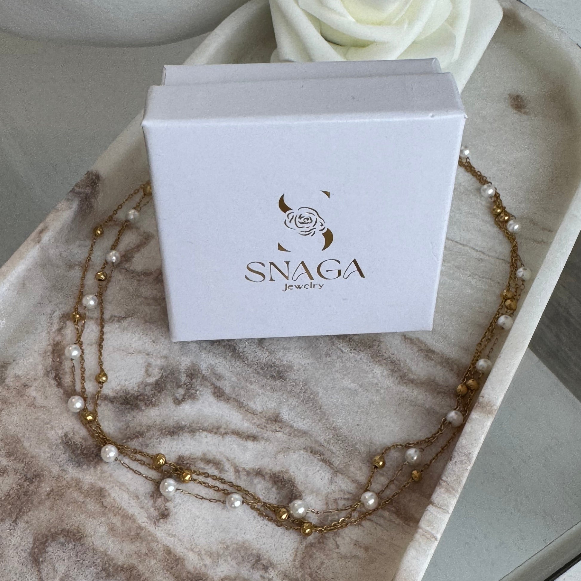 MARLENE - Collier ras de coup multi-chaine en acier Inoxydable Doré et perles blanches