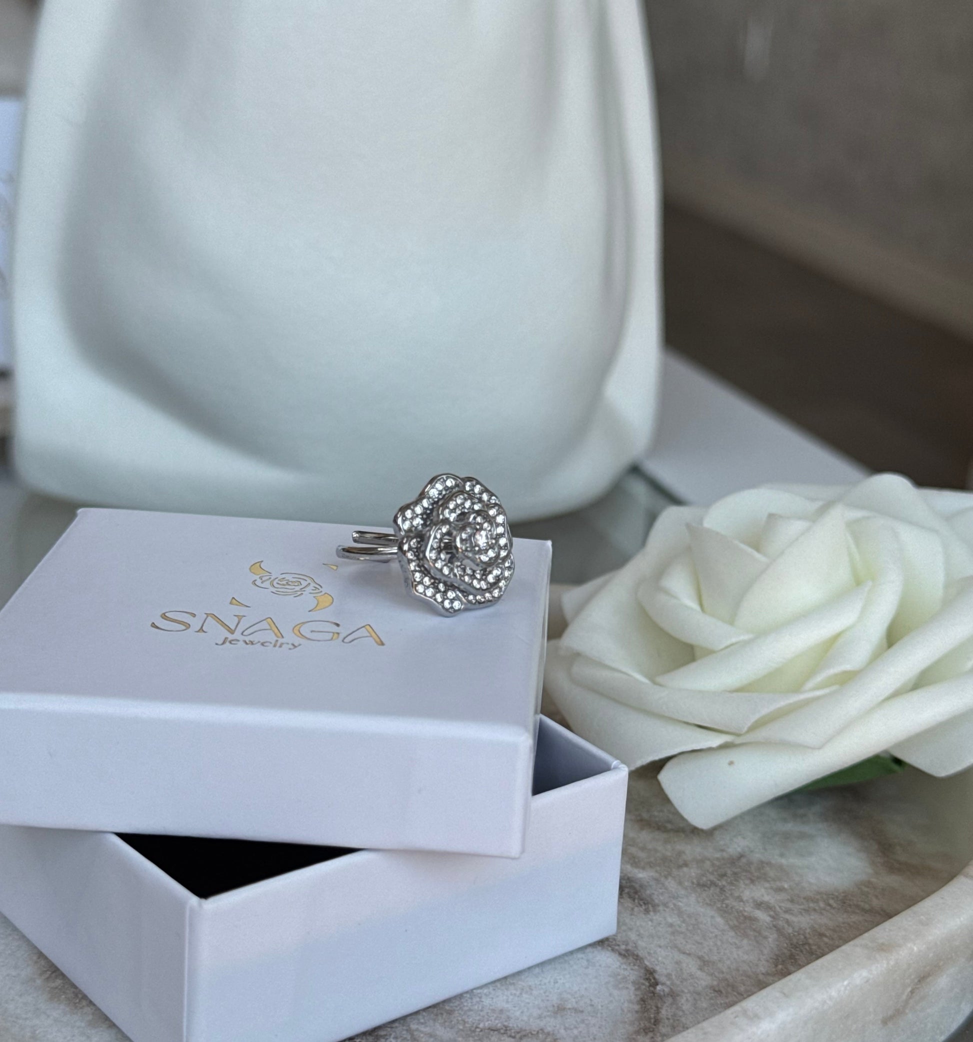 Laisse éclore ta beauté avec la Bague ROSE, un bijou délicat qui symbolise l'élégance et la féminité. Son design en forme de rose apporte une touche romantique et raffinée à toutes tes tenues. À porter seule ou en parure assortie avec le collier, le bracelet et les boucles d'oreilles pour un look harmonieux.